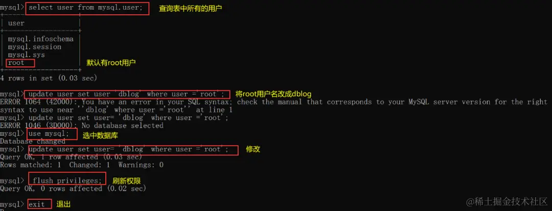 7.至此,mysql中,将root用户名修改成dblog就完成了。