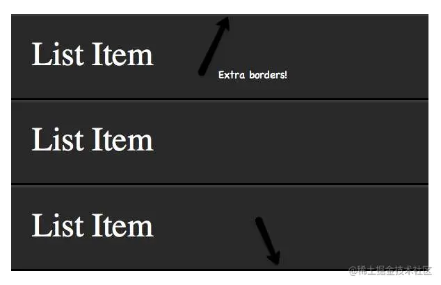 唯一的问题是,上图中无序列表的顶部和底部也会有边框,看起来有点奇怪。可以用伪类:first-child和:last-child来解决。