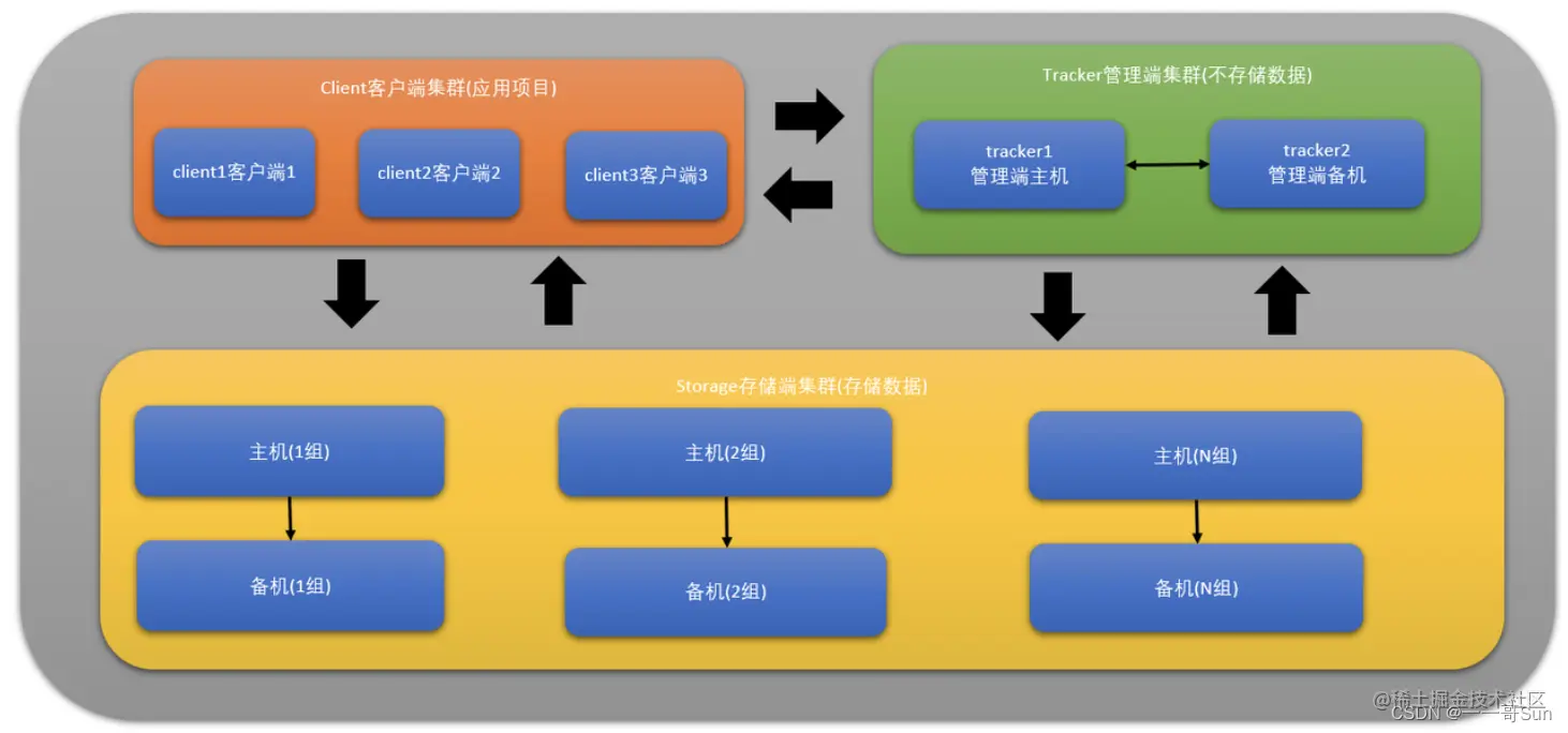 - 首先管理端tracker不存储具体的文件,它用来管理storage存储端集群服务器。tracker可以是一主多从,备机每隔一段时间ping主机,主机返回pong命令,具有心跳检测机制。如果主机宕机,不返回pong命令,那么备机会替代主机工作。请求进入靠tracker管理端分配,具体将文件存储到哪一个storage存储端服务器,具有负载均衡功能。