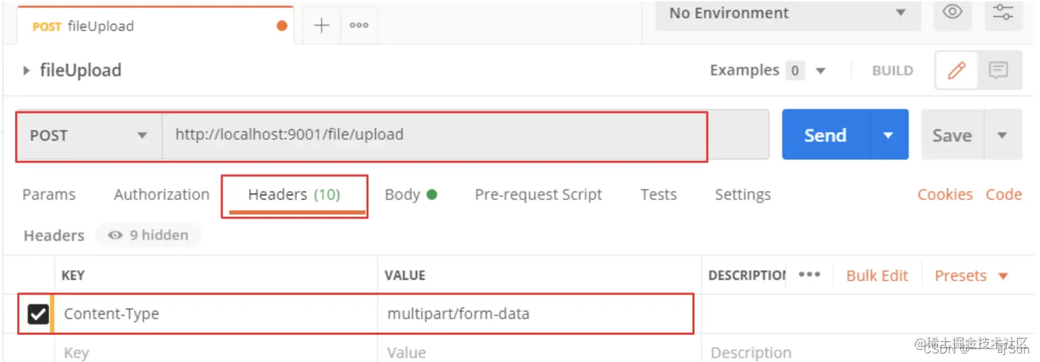 - 选择post请求方式,输入请求地址 http://localhost:9001/file/upload