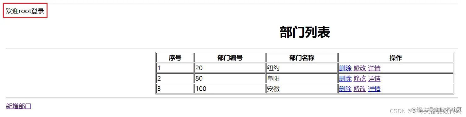 (3)达到的效果:直接跳过登录页面,直接访问/dept/list资源是行不通的;但是只要登录上,当前会话没结束(浏览器没关闭);打开新的窗口,直接访问/dept/list资源也是可以的;因为访问的一直是同一个session对象!