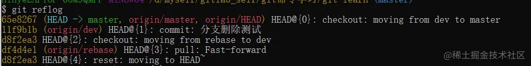 这个可是救命的操作。git reflog 命令是用来恢复本地错误操作很重要的一个命令:显示可引用的历史版本记录。