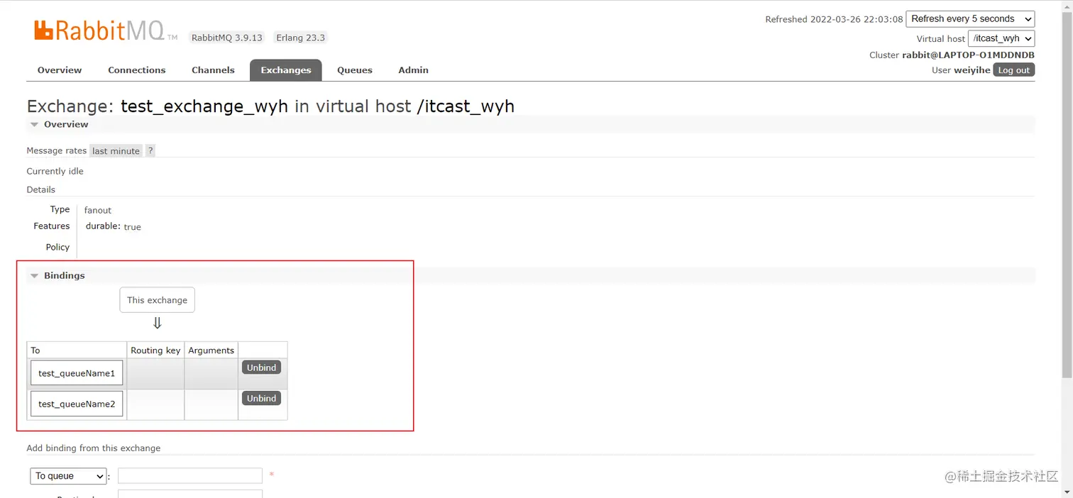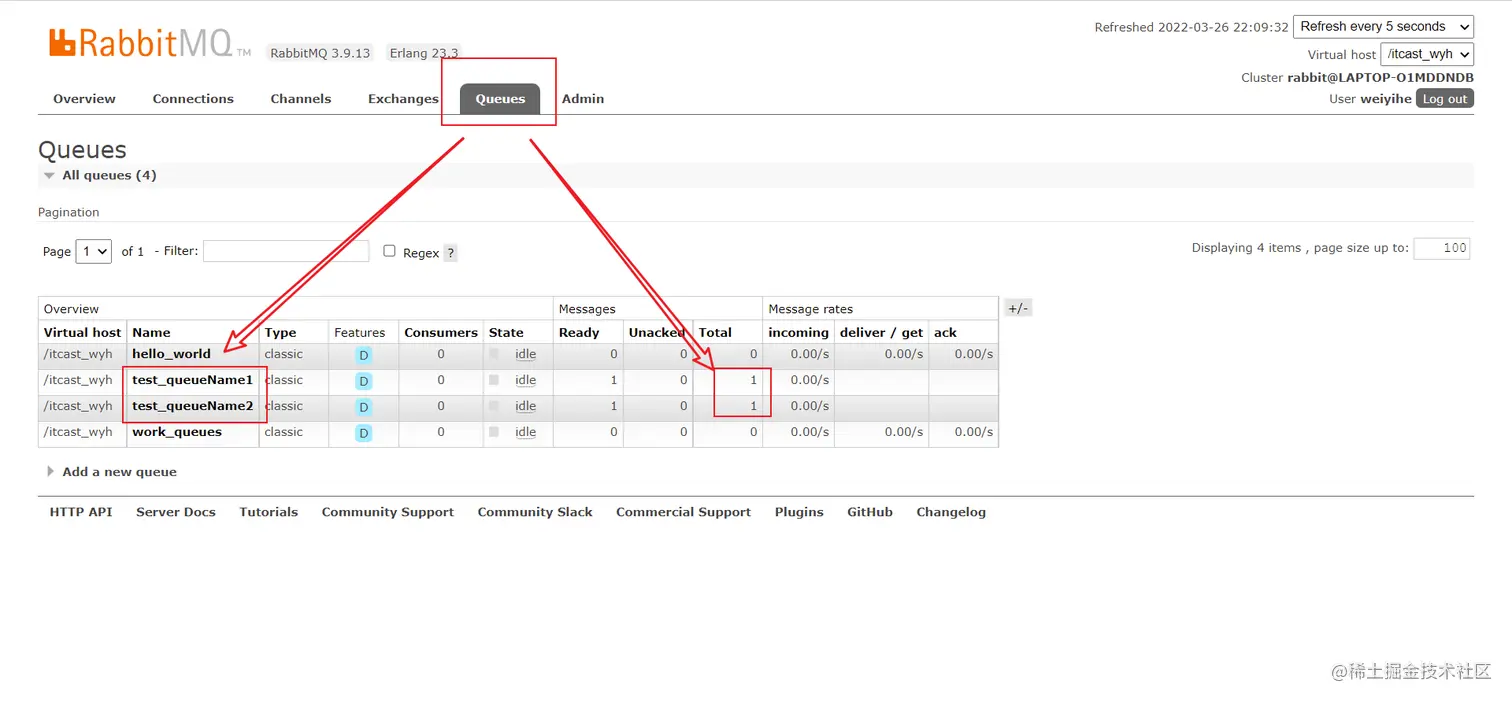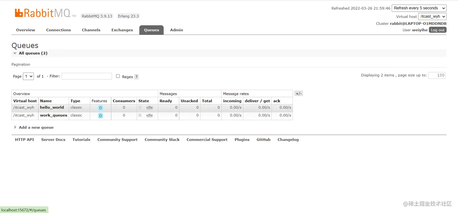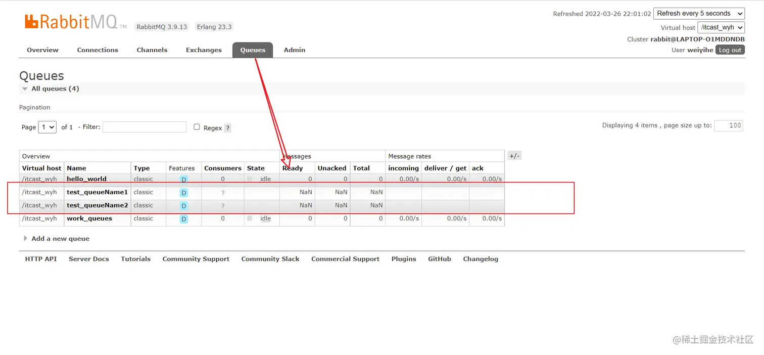 执行代码运行,发现多了两个队列,就是我们程序中写的队列名称