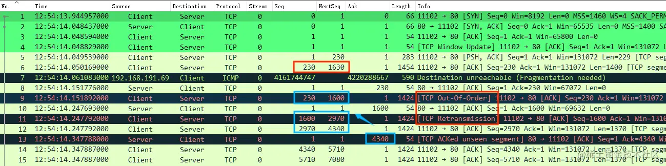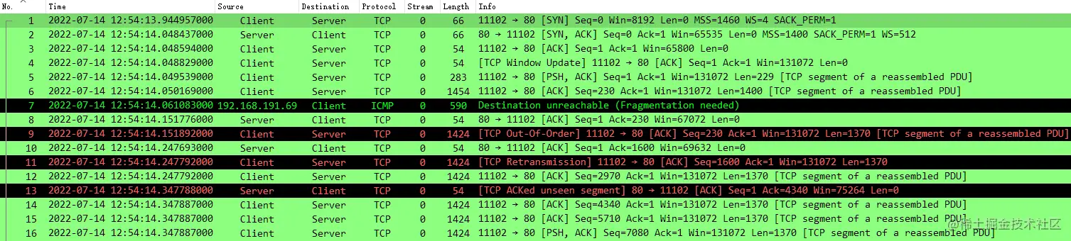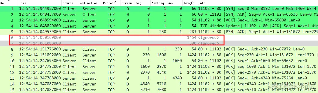 需要注意的是,因为 Client No.6 实际由于 MTU 问题未正常发送到 Server ,Client 重新根据新的 MTU 进行了数据包调整发送的缘故,Wireshark 在此处的判断逻辑并没那么智能,会由于 No.6 Seq 误判断 No.9 为乱序、No.11为重传等,实际上并不是,可以通过忽略 No.6-7 数据包的方式重新观察,如下,一切正常。