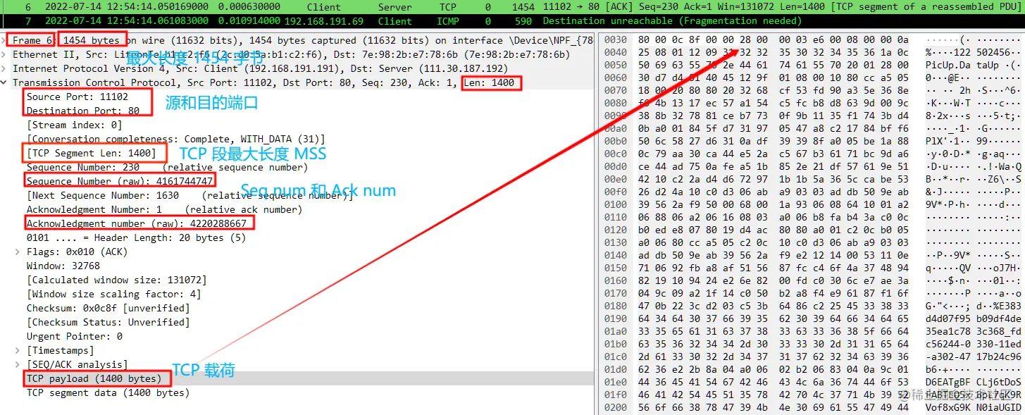 - 数据包 No.6 ,Client 发送了最大长度为 1454 的数据包;