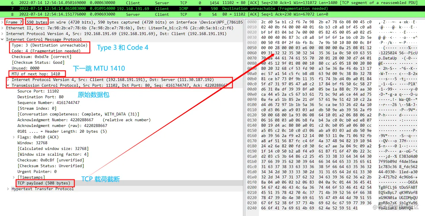 No.7 数据包为 ICMP 报文,为类型 3 、代码 4 表示需要分片的消息(Fragmentation needed) ,消息中包含它可接受的 MTU 值为 1410;之后的 IPv4 首部、TCP 首部以及 HTTP 数据为 No.6 原始数据包的部分信息,相关信息可与 No.6 一一对应。