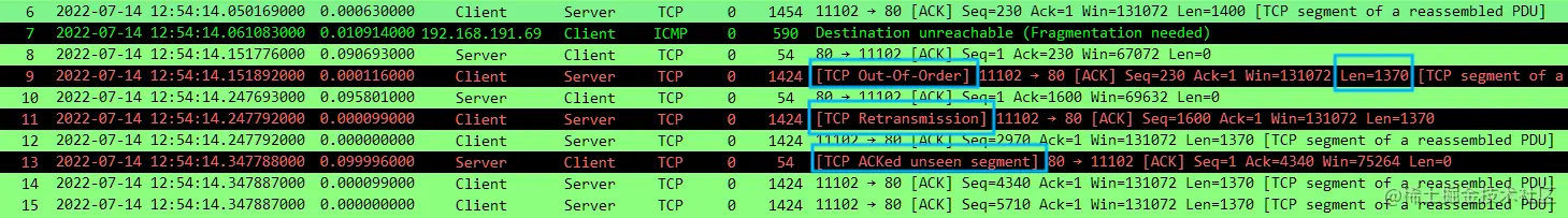 - Client 在收到 No.7 之后,得知下一跳 MTU 为 1410,因此会调整 MSS 为 1370(1410-40),发送数据包 No.9;