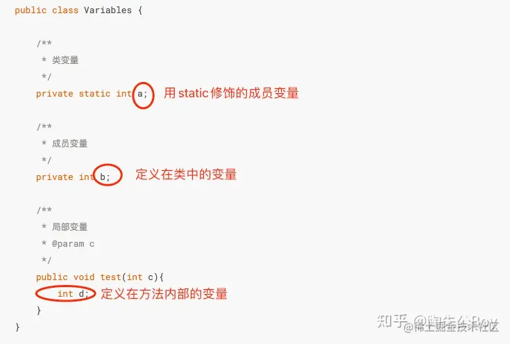 类变量: 也称静态变量,也就是在实例变量前加了static 的变量。类变量定义在类中但独立于方法和语句块之外,静态变量可以通过ClassName.VariableName的方式访问。类变量被声明为public static final类型时,即常量,类变量名称一般使用大写字母。