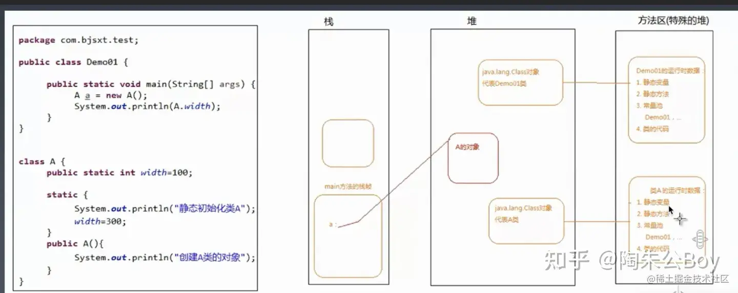 接下来的这段示例代码,我们类Demo01的main方法内部定义了一个类型A的局部变量a,在类A中定义了一个类变量width;一起看看它们在VM内存区域的分布: