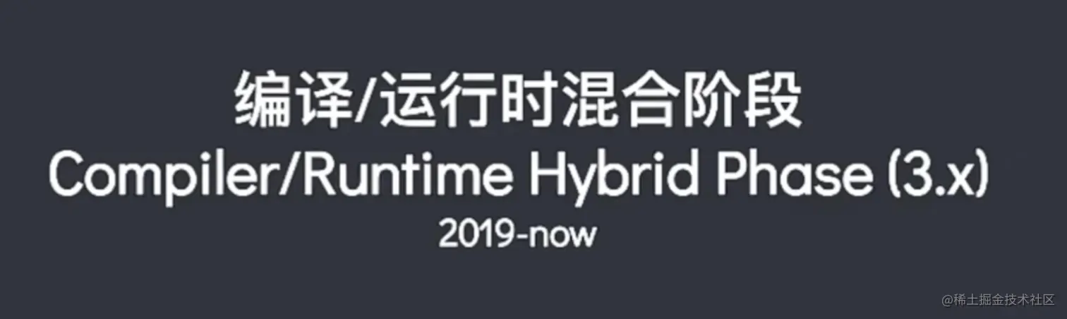2019年至今,Vue 进入了编译/运行时混合阶段。虽然 2.0 阶段引入了编译,但是 2.0 的编译和运行时的结合是非常浅的结合,编译器编译出 Virtual DOM 渲染函数就到此为止了,编译器对运行时是怎么样的并没有太多概念,而运行时对于编译器也是没有概念的,这样很多优化空间就被浪费了。所以 3.0 阶段的主要目标就是让编译器和运行时都属于框架的一部分,它们本身就是耦合的。 在耦合的前提下,让编译器为运行时提供更多的信息,让运行时知道编译器提供的信息。