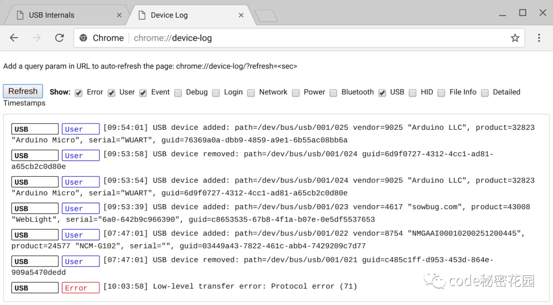 你还可以在 Chrome 的内部页面 about://device-log 方便的调试 USB 设备:
