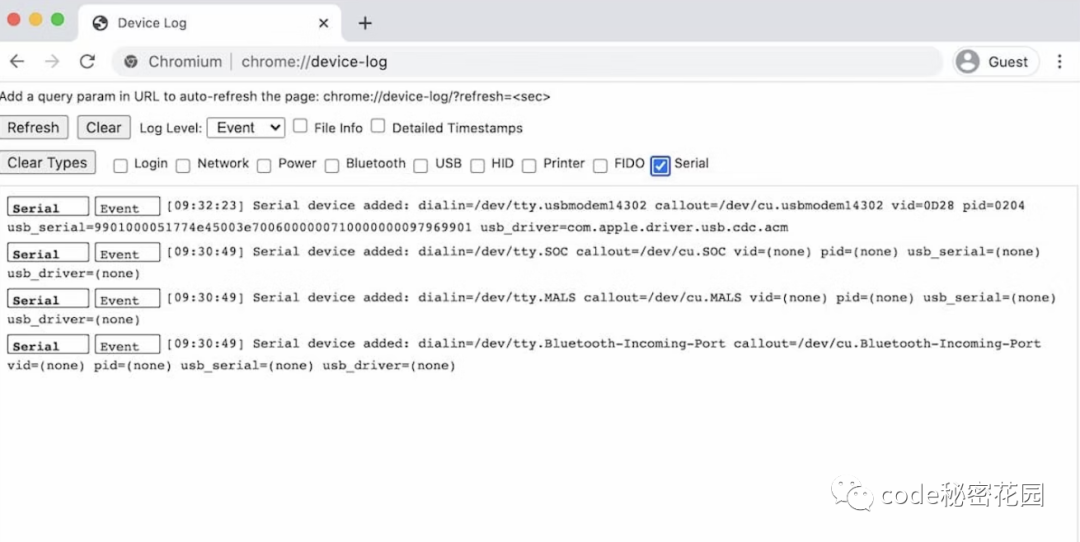 同样的,你也可以在 Chrome 的 about://device-log 对串口设备进行调试。