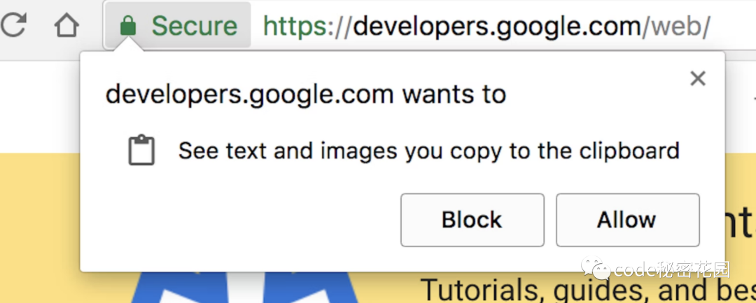 另外,document.execCommand() 还有一个非常明显的问题就是权限控制过于宽松了,在很多情况下我们可能会担心网站是否会私自读取我们剪贴板的信息,Asynchronous Clipboard API 仅支持 HTTPS 页面,另外在读取剪贴板是会向用户发送许可,这保证了网页必须在用户同意的情况下才能读取剪贴板: