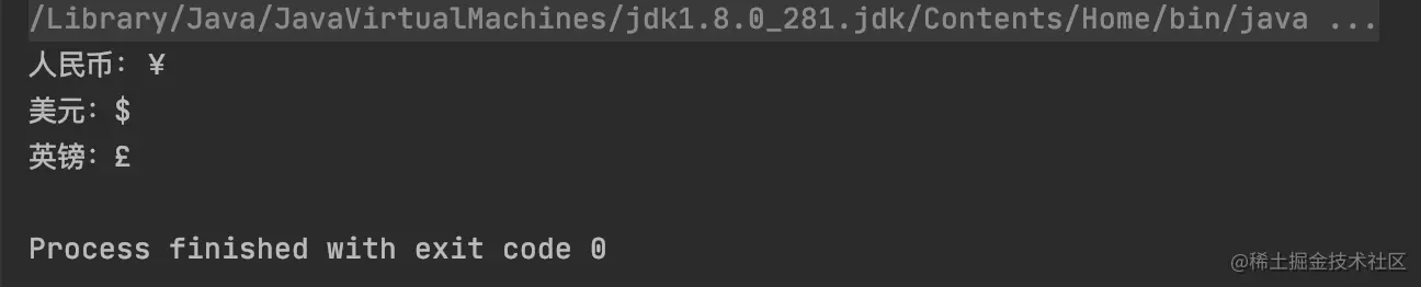 System.out.println("英镑:" + Currency.getInstance("GBP").getSymbol(Locale.UK));