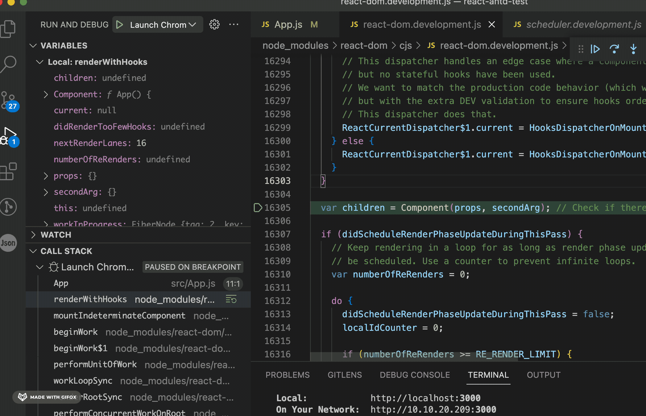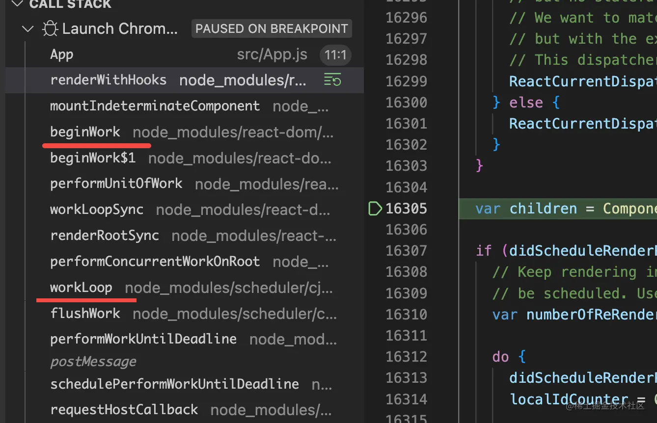 比如这个 App 的函数组件,你可以看到渲染这个函数组件会经历 workLoop、beginWork、renderWithHooks 这些流程: