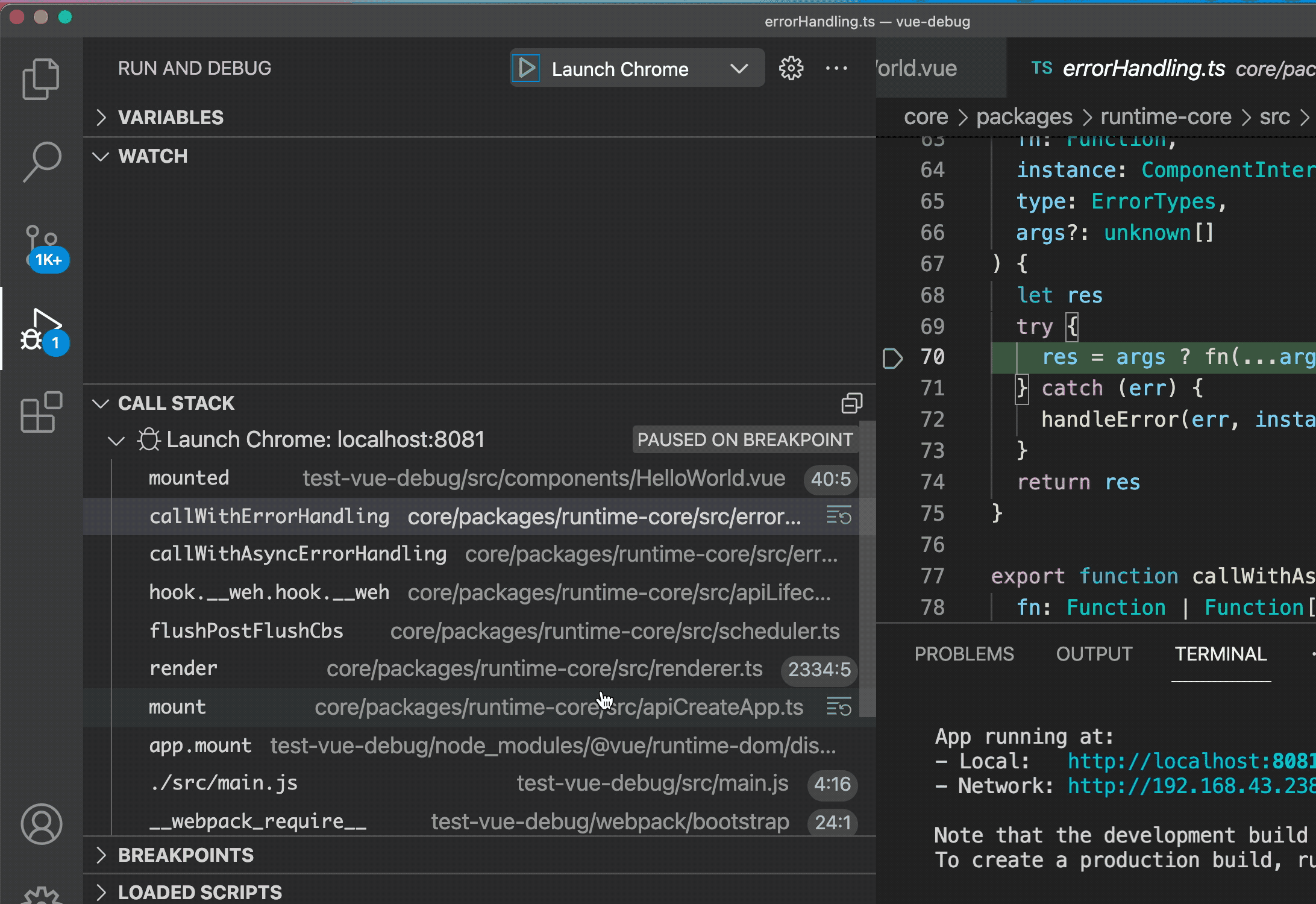 比如 vue,关联了 sourcemap 之后,我们能直接调试 ts 源码: