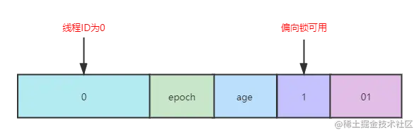 当开启偏向锁时,类的prototype_header中的锁标志位为01,是否可偏向locked_bias为1,thread id为0,表示匿名偏向(anonymously biased)。