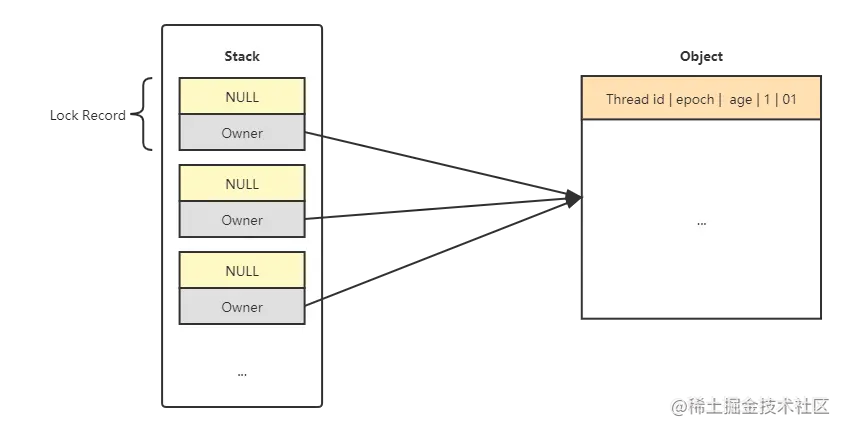 偏向锁加锁,会向获取到锁的线程栈中插入一条Lock Record,其中的属性Displaced Mark Word为null,Owner指向当前锁对象。