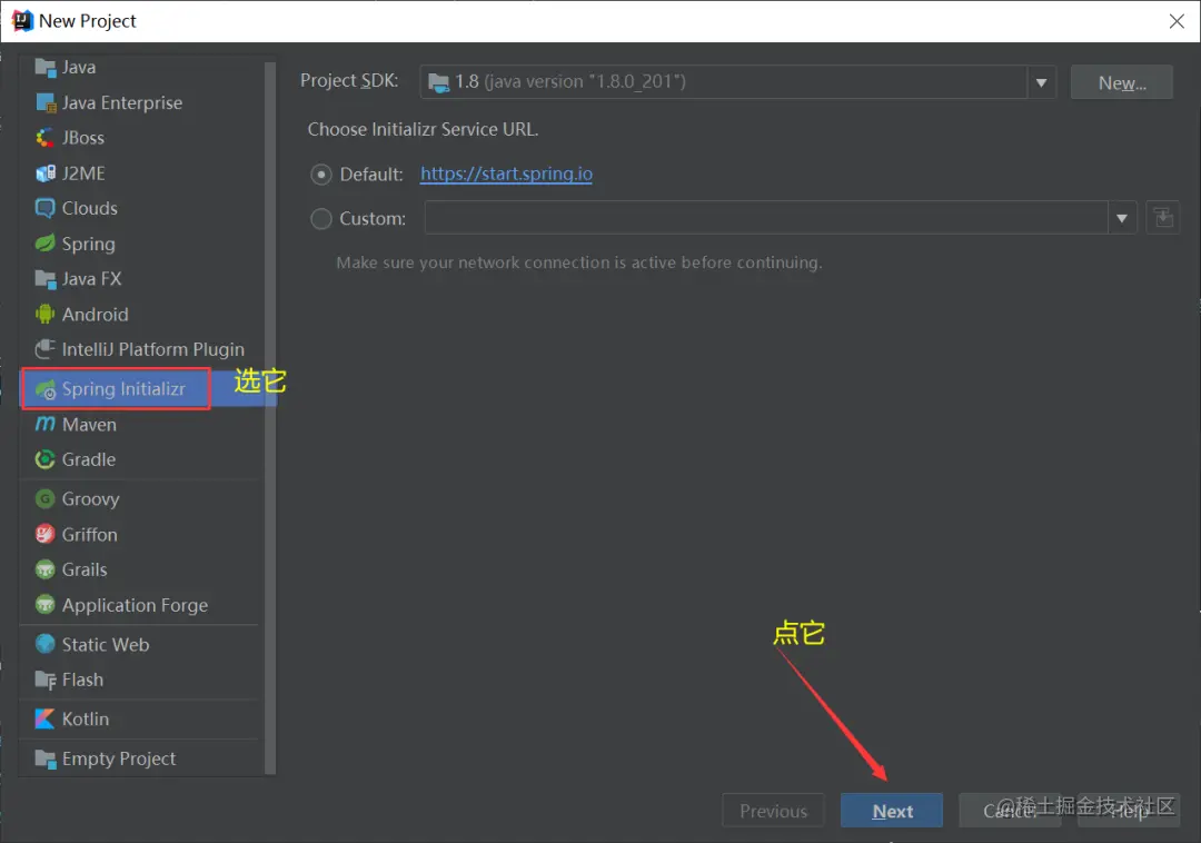 打开你的idea,点击File->New->Project,选择Spring Initializ,然后Next。