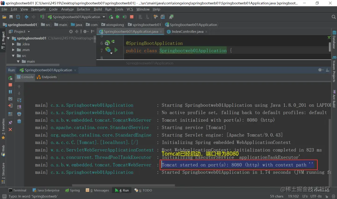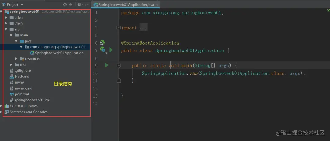 然后我们就可以去运行了,首先打开Springbootweb01Application.java类,在这里( src\main\java\com\xiongxiong\springbootweb01\Springbootweb01Application.java),找到main方法,然后运行: