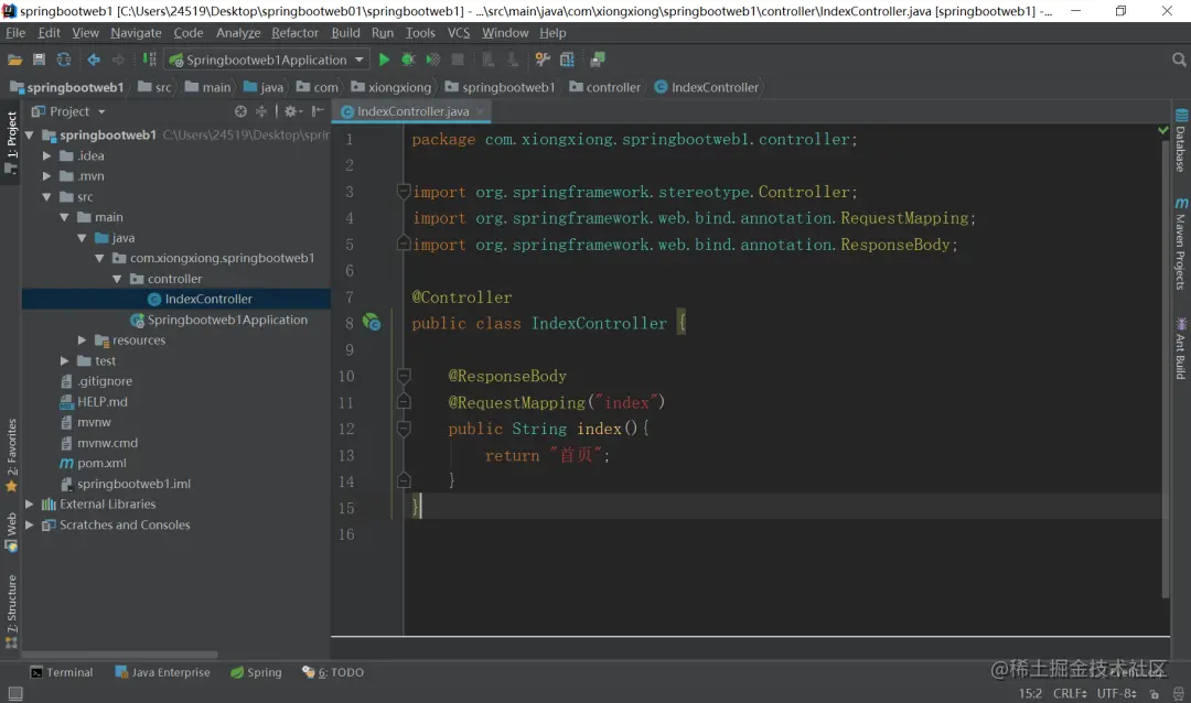 然后在com.xiongxiong.springbootweb1包下面新建package,命名为controller,后面的步骤就和上面一样了,大家可以网上翻的看看,最后如下: