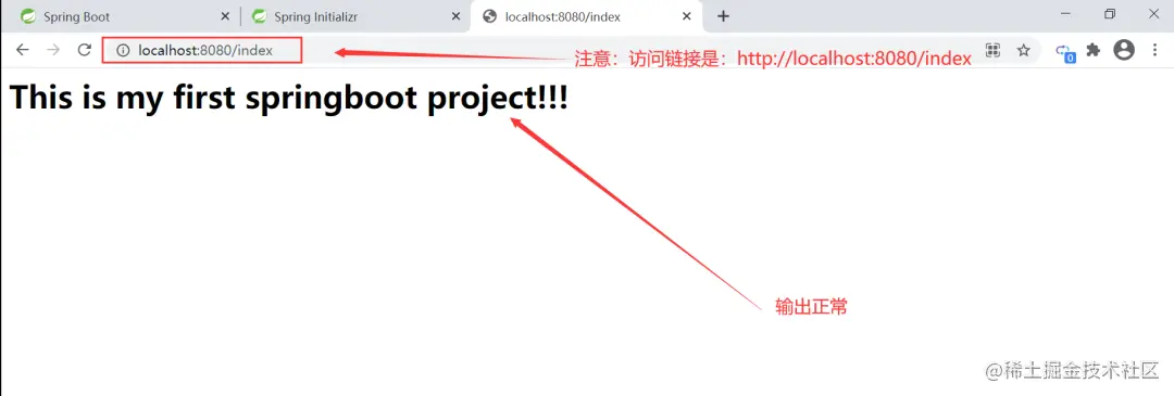 我们可以看到控制台中输出了*Tomcat started on port(s): 8080 (http) with context path '' *,表明Tomcat已经启动,然后我们去浏览器中访问控制器中设置的请求规则index试试,地址栏中输入:http://localhost:8080/index
