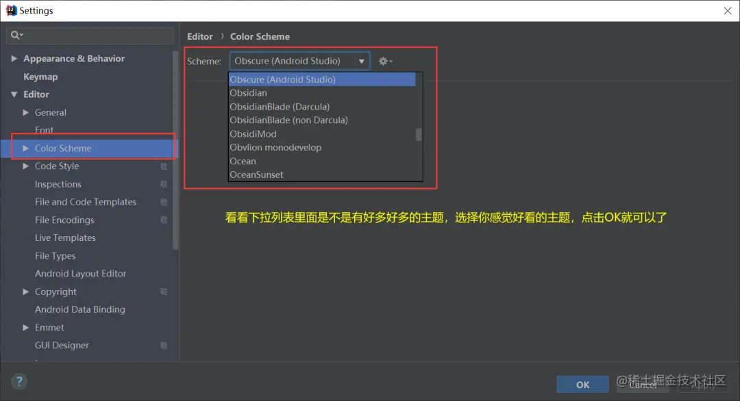 点击File->Settings->Color Scheme->选择自己感觉好看的主题。