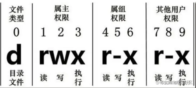 (1)0 首位表示类型 ,在Linux中第一个字符代表这个文件是目录、文件或链接文件等等