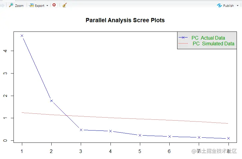 在这个数据集中,数据是由变量的相关系数组成而非原始的数据集,先进行筛选主成分因子,利用平行分析得出碎石图: