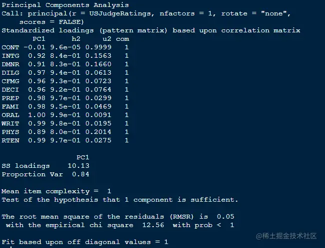 pc <- principal(USJudgeRatings,nfactors = 1,rotate = "none",scores = FALSE)