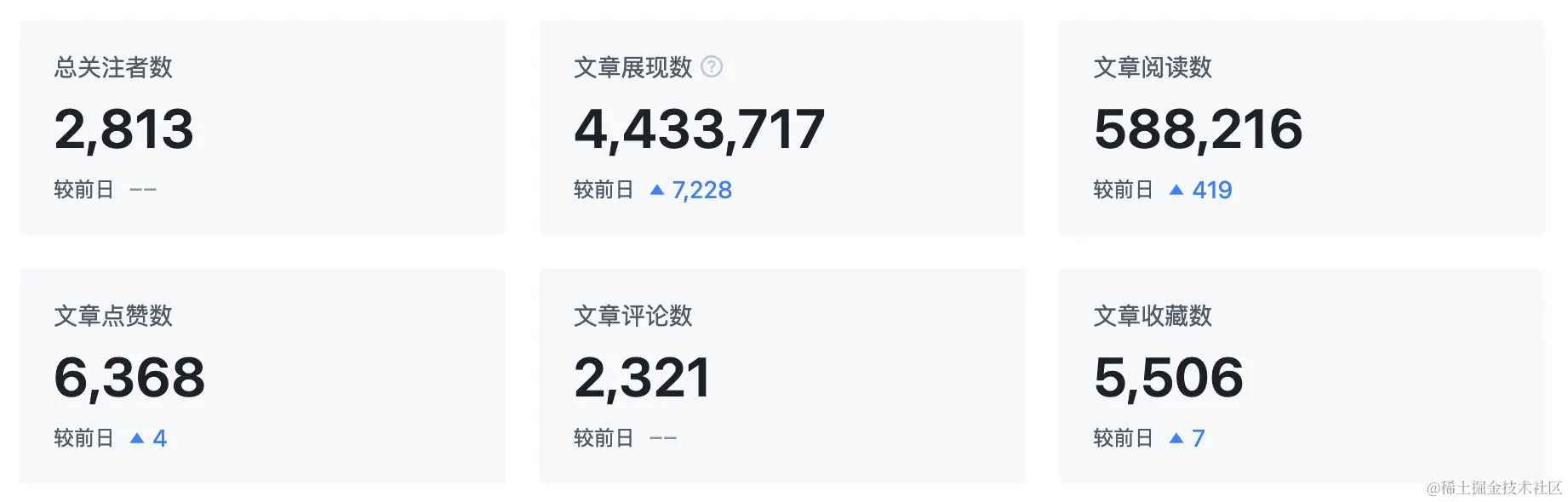 有三篇发在我个人的掘金账号(因为是刚刚开始运营的个人掘金账号,数据非常惨淡就不贴出来),大家多多支持下我的个人掘金账号呀,后续我也会持续分享一些前端和开源方面的经验。