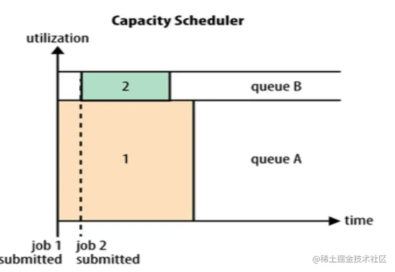 Capacity可以理解成一个个的资源队列,这个资源队列是用户自己去分配的。队列内部又可以垂直划分,这样一个组织内部的多个成员就可以共享这个队列资源了,在一个队列内部,资源的调度是采用的是先进先出(FIFO)策略。