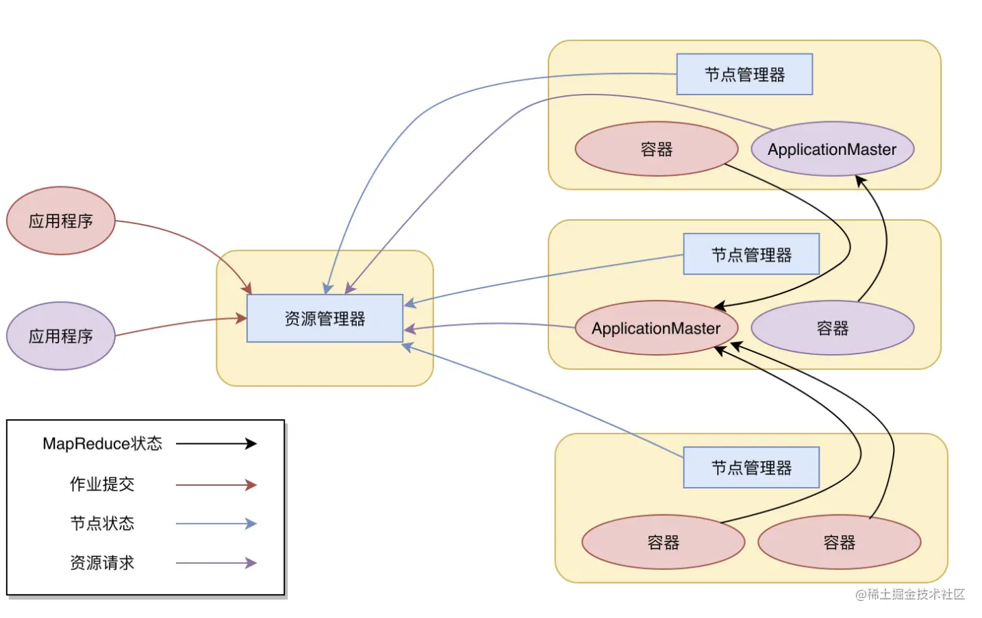 应用程序管理器负责应用程序的提交、监控应用程序运行状态等。应用程序启动后需要在集群中运行一个 ApplicationMaster,ApplicationMaster 也需要运行在容器里面。每个应用程序启动后都会先启动自己的 ApplicationMaster,由 ApplicationMaster 根据应用程序的资源需求进一步向 ResourceManager 进程申请容器资源,得到容器以后就会分发自己的应用程序代码到容器上启动,进而开始分布式计算。