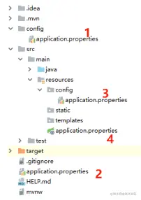 首先,当我们创建一个 Spring Boot 工程时,默认 resources 目录下就有一个 application.properties文件,可以在 application.properties 文件中进行项目配置,但是这个文件并非唯一的配置文件,在Spring Boot 中,一共有 4 个地方可以存放 application.properties 文件。
