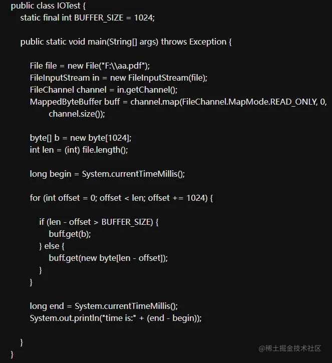 这里创建了一个只读模式的内存映射文件区域, 接下来我就来测试下与普通NIO中的通道操作相比性能上的优势,先看如下代码: