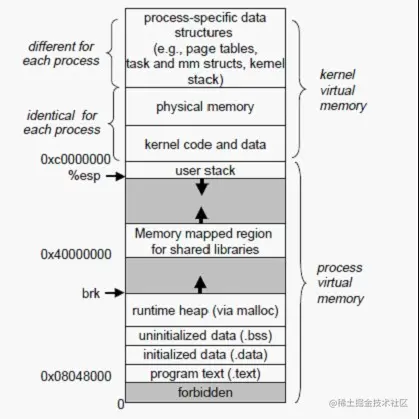 Linux中的进程虚拟存储器, 即进程的虚拟地址空间, 如果你的机子是32位,那么就有2^32=4G的虚拟地址空间,我们可以看到图中有一块区域: