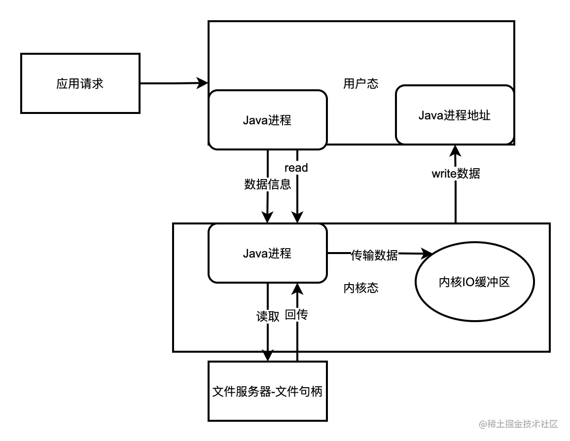 在传统的文件IO操作中, 我们都是调用操作系统提供的底层标准IO系统调用函数read()、write() , 此时调用此函数的进程(Java进程) 由当前的用户态切换到内核态, 然后OS的内核代码负责将相应的文件数据读取到内核的IO缓冲区,然后再把数据从内核IO缓冲区拷贝到进程的私有地址空间中去,这样便完成了一次IO操作,如下图所示。