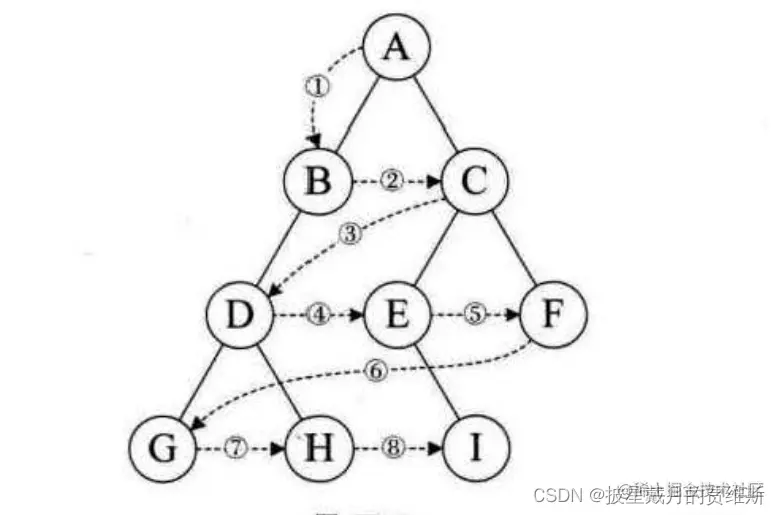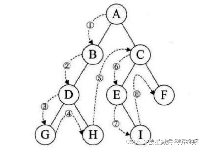 规则是若 叉树为空,则空操作返回,否则先访问根结点,然后前序遍历左子树,再前序遍历右子树。如图遍历的顺序为: ABDGHCEIF