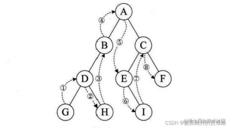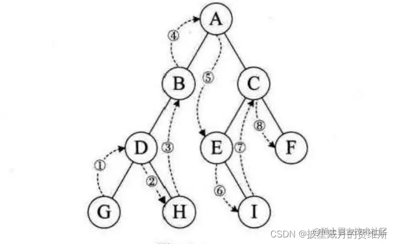 规则是若树为空,则空操作返回,否则从左到右先叶子后结点的方式遍历访问左右子树,最后是访问根结点 如图所示 遍历的顺序为 GHDBIEFCA。