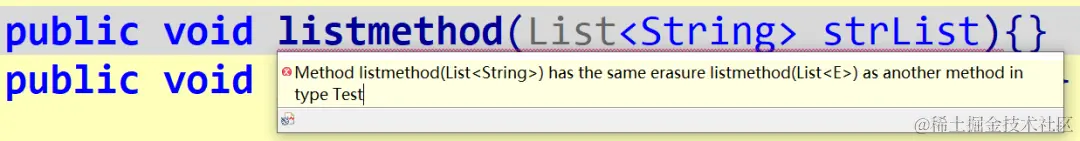 这个错误的意思就是,listmethod<List方法在编译时擦除类型后为listmethod<List与另一个方法重复(listmethod<List),也就是说方法名一样,注意这里的一样是指方法名和参数都一样,故报错。