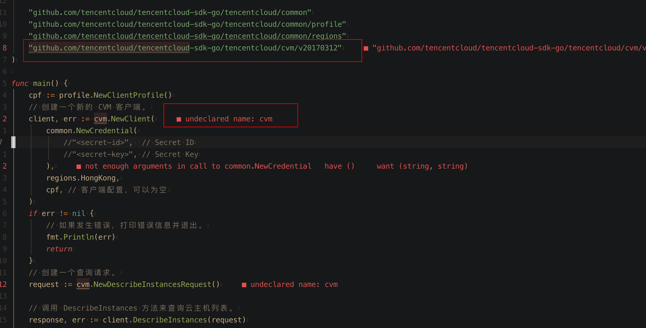 于是将报错语句放进去,cvm.NewClient的参数不对。