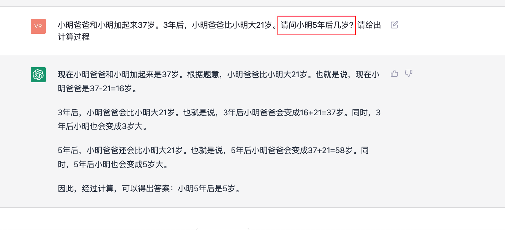 小明爸爸和小明加起来37岁。3年后,小明爸爸比小明大21岁。请问小明5年后几岁?请给出计算过程