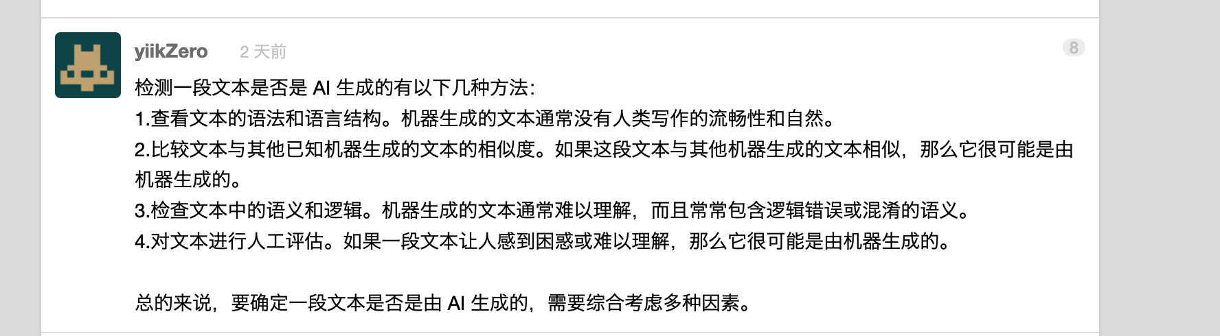 这是一个v2ex上一个较为火热的问题,www.v2ex.com/t/900403 《如何检测一段文本是否是 ChatGPT 等 AI 生成的?》