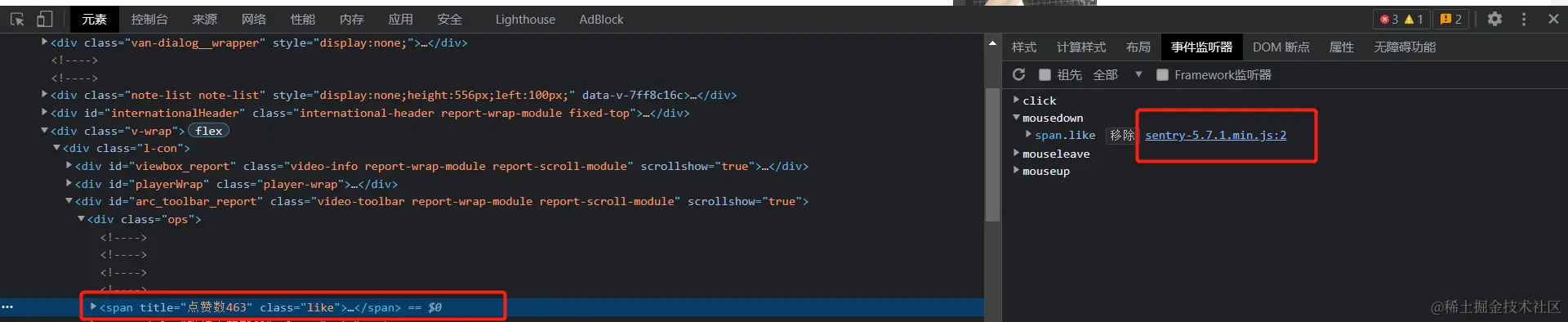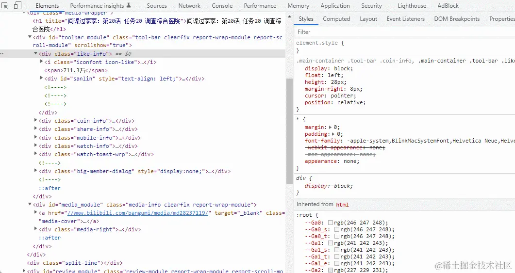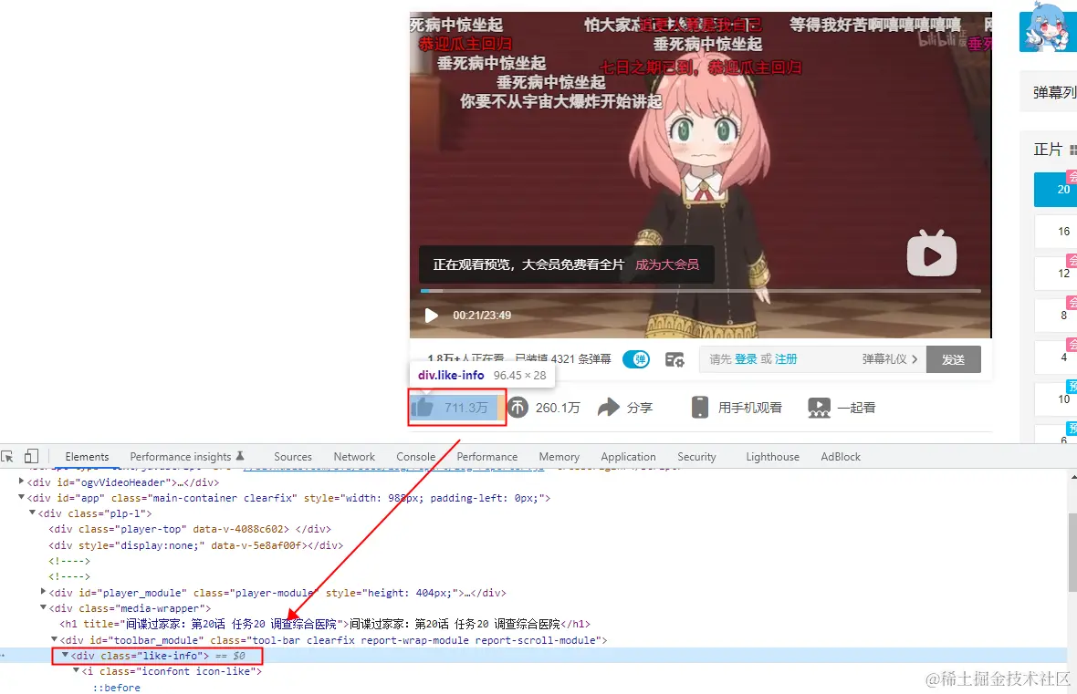 首先,我们通过F12打开浏览器的调试工具栏,并进入【元素】面板。然后,鼠标移到点赞按钮上,找到其对应的DOM元素<div class="like-info">