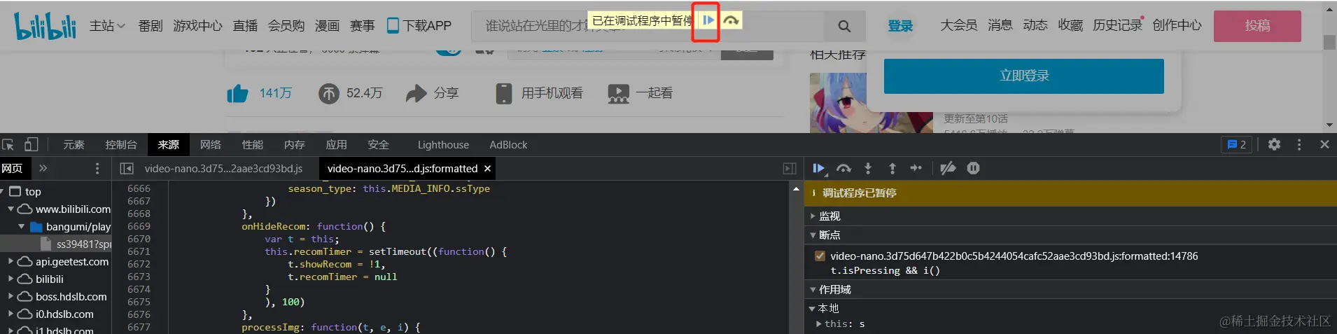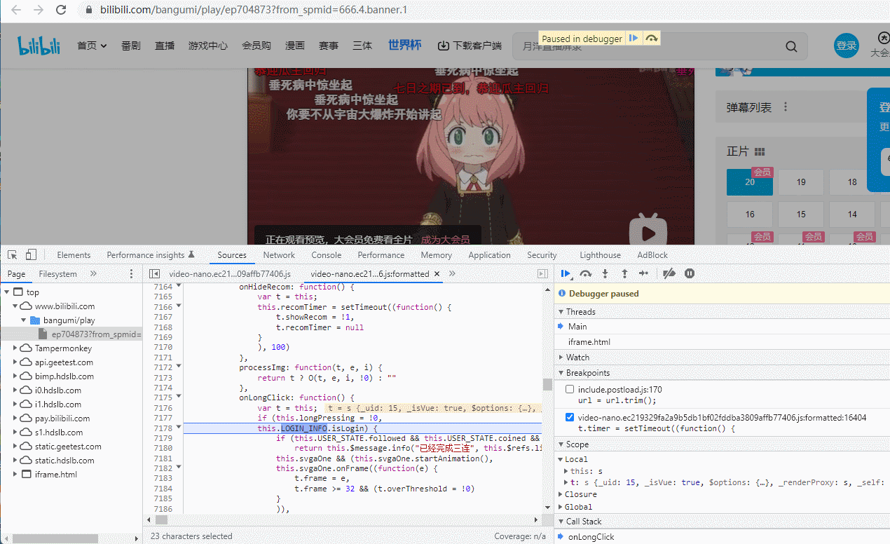 由于B站的页面是多种技术开发出来的,该方法目前只对Vue开发的页面有效。比如:如果一开始mousedown对应的源文件为sentry-5.7.1.min.js这类的,那么之后的步骤就都不可以了,只能换个视频(目前番剧都可以使用此调试方法)。