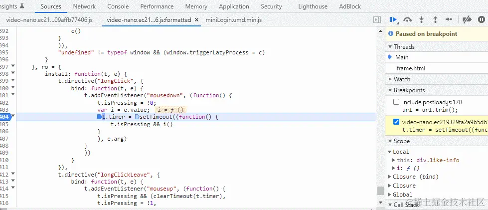 由于一键三连需要长按点赞按钮,因此,其逻辑是绑定在mousedown上的事件。我们点击mousedown,找到其对应的JS源文件(video-nano.xxxx.js),然后进入。