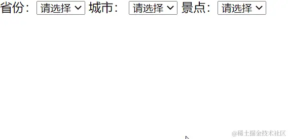 首先,看运行效果,可得需要三个下拉列表,第一个是省份,第二个是城市,第三个则是景点,三个下拉列表的代码如下:
