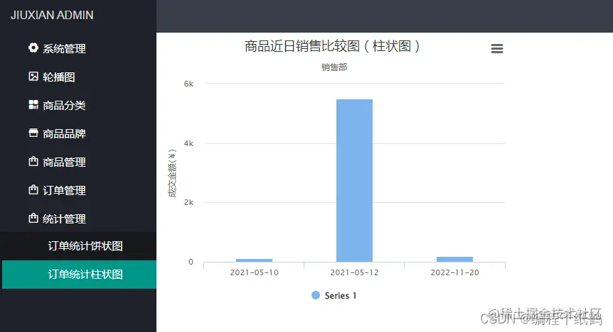 系统同样提供了强大的后台管理系统,在后台管理模块中可以实现能前台注册用户的管理操作,可以管理所有用户的订单信息,根据订单支付情况进行发货等操作。同样可以管理产品的分类,可以管理商品的信息,以图文的形式来添加商品信息。为了更好了了解商品的销售情况,在后台使用echart实现了商品销售的图形报表和订单的统计报表功能。
