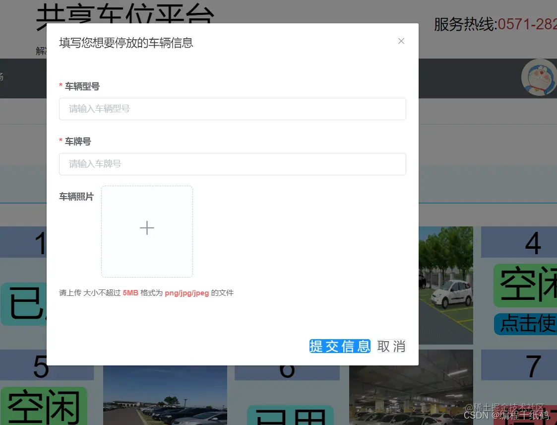 用户需要寻找车位停车时,登录本平台前台后,点击附近停车场,进入查看停车场列表页面如图5-12所示,选择一个停车场后进入该停车场内所有车位列表页面如图5-13所示,寻找一个空闲车位后点击使用按钮(也可以点击一键快速查找空闲车位),在弹窗中填写将要停放的车辆信息并提交后,就可以使用该车位了如图5-14所示。