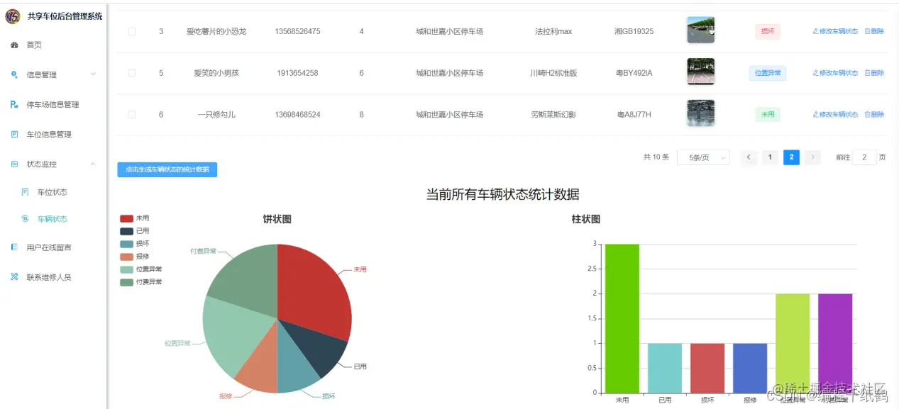 以监控车辆状态为例,管理员登录后可以在车辆列表中查看具体的车辆信息如图5-10所示,也可以点击生成统计数据,并在ECharts提供的饼状图和柱状图上展示,如图5-11所示,可以对车辆状态进行宏观监控,主要是为了方便管理员对当前的车位、车辆状态有一个直观的认识。